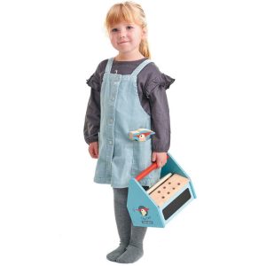 A Tender Leaf Toys branded woodpecker themed tool box filled with everything you need to build something on your own. With two removable lid pieces that turn into screwable plates, and a cloth printed bag to pack away after play, this set includes a woodpecker hammer, a pair of pliers, a screwdriver, a spanner, 2…