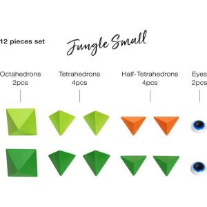 Bright Jungle colors abound in this 36-Piece Set includes: 6 octahedrons, 12 tetrahedrons, 12 half-tetrahedrons, 6 eyes (in total 36 pieces) + Leaflet + Limited Edition "Inspiration Book" With a large set you can either build one large construction or several smaller ones and share the process of creating with your fri