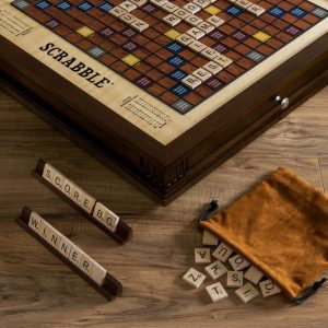 This heirloom quality Scrabble edition will be the envy of wordsmiths everywhere! It features a handsome burl-finished wood cabinet with a die-cast metal plaque and die-cast metal drawer pull. The gorgeous rotating Scrabble game surface features luxurious gold foil stamping and a raised letter tile grid. Upon opening t