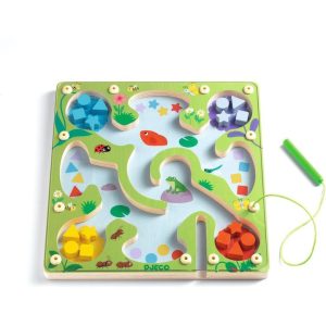 FrogyMaze is a magnetic sorting game for ages 3 and up. Using the magnetic pen, move the pieces according to their shape and color to sort them into the 8 spaces on the board. The "color" spaces are identified by a colored flower, and the "shape" spaces show the different pieces to be sorted. You'll…