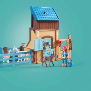 Join Amelia and Whisper at the Pony Stable! Open the fence to the pony stable and join Amelia in caring for and feeding the ponies and Alpaca! Includes lots of storage to hang brindles and saddles and store other grooming equipment. Use the glitter brush to comb through the horse hair or add the hair…