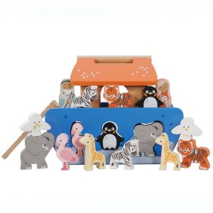 Ark with removable roof panels and side panels, Mr & Mrs Noah, 2 elephants, 2 crocodiles, 2 penguins, 2 lions, 2 butterflies, 2 bears, 2 geese, 2 giraffes, 2 tortoises, 2 zebras. PREMIUM SHAPE SORTER – You want the very best for your child and this toy delivers. Made from the highly renewable rubber tree…