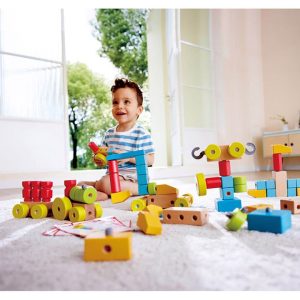 These sturdy blocks will inspire hours of play and generations of builders. Explore how different shapes can make towers higher or wider. How high can you build without toppling over? Build a house and tell stories about who lives there. Sturdy, solid, and including all of our favorite colors, this Hape block set inclu