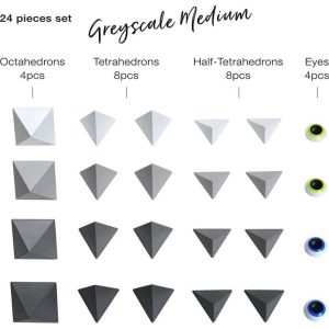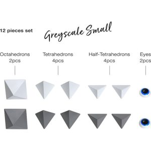 Black, grey and white scale pieces make up the monochromatic set which comes with 36 pieces includes: 6 octahedrons, 12 tetrahedrons, 12 half-tetrahedrons, 6 eyes (in total 36 pieces) + Leaflet + Limited Edition "Inspiration Book" With a large set you can either build one large construction or several smaller ones and