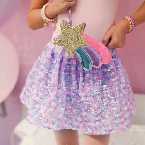 Introducing our brand new Shooting Star Purse, a delightful accessory that will make your little one shine. This charming purse features a gold star embellishment, with vibrant pink, purple and blue accents, adding a touch of magic to their outfit. With its compact size and adjustable strap, it is perfect for little ha