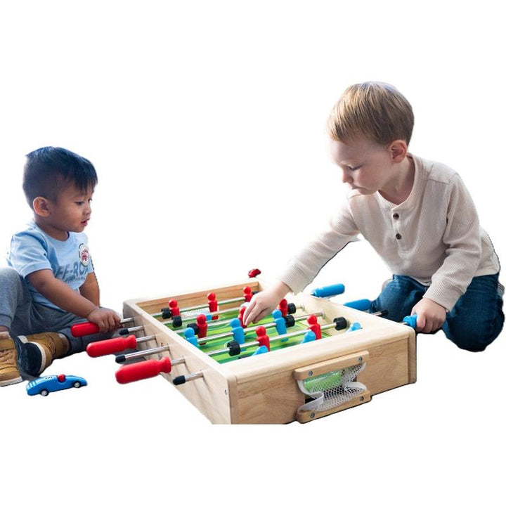 Games for 2! Foosball or Ice Hockey take your pick with this 2 sided table top game designed for fun, improves fine motor skills, concentration, co-operative play and logical thought. Ages 3+ Materials: Wood, Steel Care instructions: Wipe with damp cloth, air dry; do not immerse in water PLEASE NOTE: This item is exclu