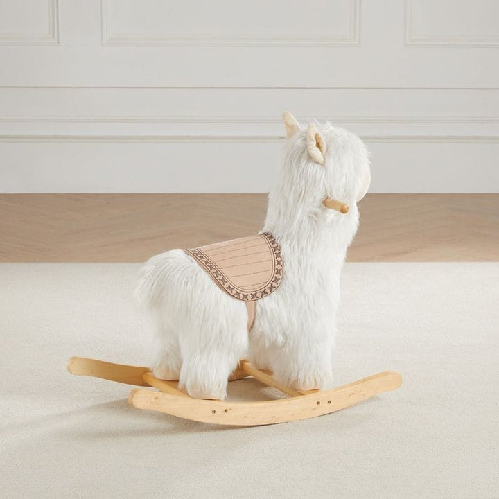 It’s a vast dessert out there, but the nursery or playroom is safe with our Alpaca Rocker. Soft faux fur and an authentic saddle, mane and tail nestled atop strong wooden rockers. Perch your toddler on the saddle and let the adventure begin. Never leave baby unattended. Ages 18 months to 3 years or 70 lbs. Materials: