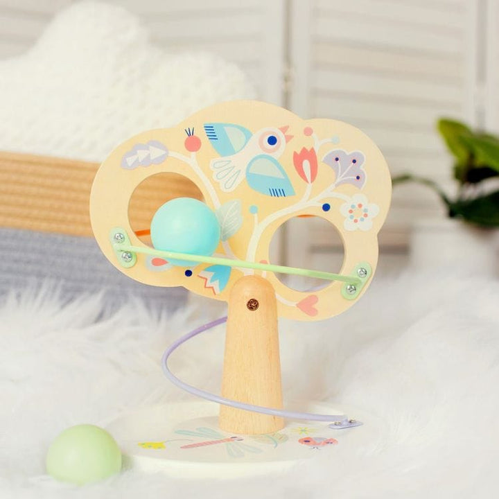 1 tree-shaped natural wood ball slide toy in pastel colors for little ones aged 18 months plus. Children have fun running the two wooden balls down the colored metal wires until they reach the foot of the tree. The balls go around the tree, disappearing and reappearing on the other side. Contents: 1 tree (wood and meta