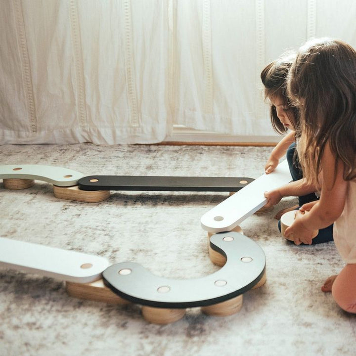 Walk the straight and narrow on our Balance Beam. Little feet can trapse across the nearly 4″ wide wooden planks, Kids can set up any configuration using the 10 connecting pieces, with 4 straight and 2 curved planks. All wood and non-toxic paint make this a fun activity that helps develop large motor skills and can
