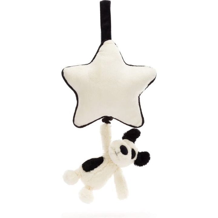 Bashful Black & Cream Puppy Musical Pull is sure to send little ones to a joyful dreamland. Tiny Bashful Black & Cream Puppy hangs from a soft cream star with contrast piping, all created from recycled fibres, and can be pulled down to play the sweet original Jellycat Lullaby. Tested to and passes the European