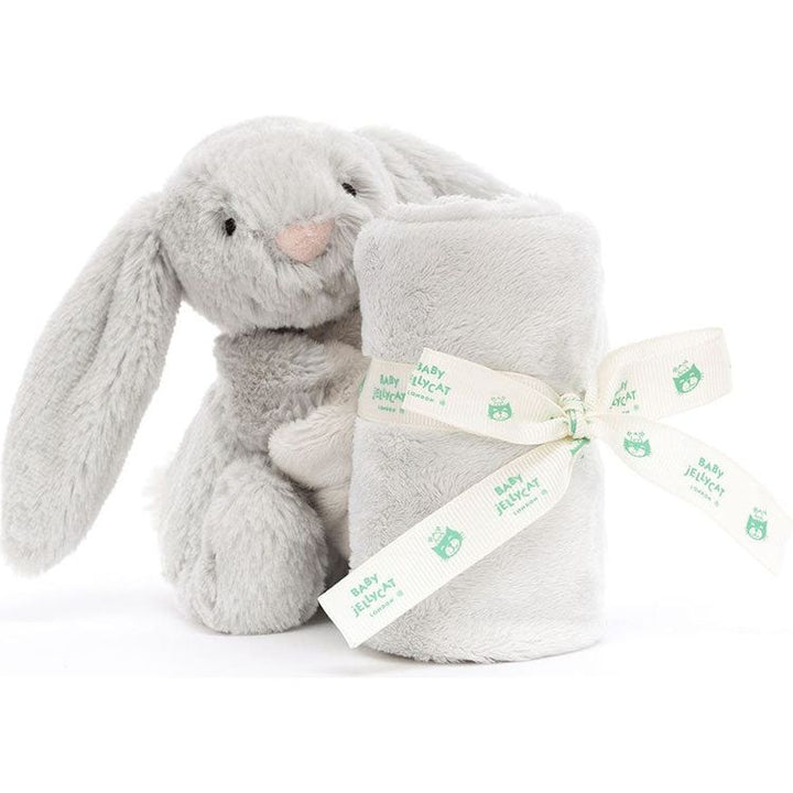 A perfect gift for newborns, the Bashful Bunny Soother is our most loved Bashful Bunny in a soft fur, with long lopped ears, a pink suedette nose and stitched eye detail holding a square shaped soother, un-stuffed and irresistibly soft to touch. Made from recycled fibers and neatly rolled up and presented with a Baby J
