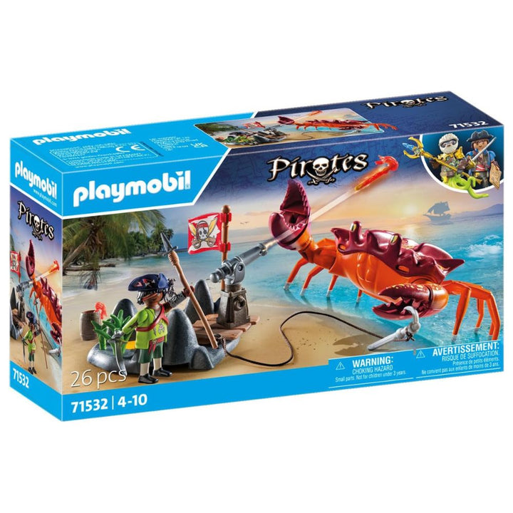 It's eight giant crab legs versus two pirate legs at the Battle of the Giant Crab! Who will win? The pirate faces the enormous crab armed with his grappling hook cannon. However, the crab quickly grabs the pirate with its mighty claw and tosses him into the sea. With imaginative characters, fantastic features, and cree