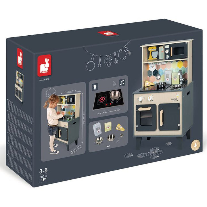 Prepare tasty little dishes for your friends, just like mom and dad, and become a Little Chef!!! Mozaïc big cooker is made from wood and has a utensil hook for hanging 1 skimming ladle, 1 saucepan and 1 metal colander, and 3 cardboard food boxes (cheese, flour, rice). Just like a real kitchen, it has a hob complete w