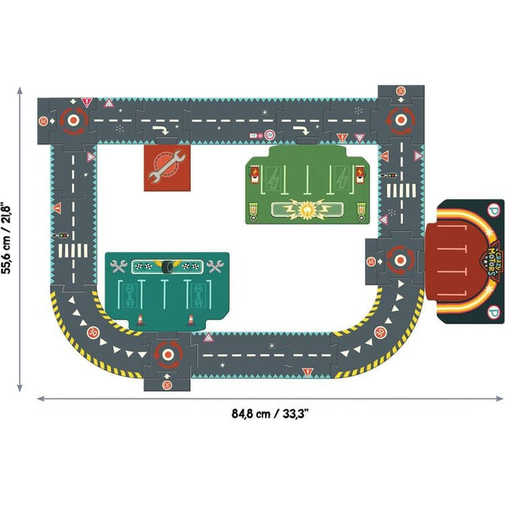 A giant circuit made up of 24 pieces to create different routes and play with the Crazy Motors cars. Let’s go! Multiple possible circuits. Large pieces made of very strong card and easy to assemble.  Large car parks    Ages 3 – 9 years Includes: 24 piece puzzle made of printed cardÂ