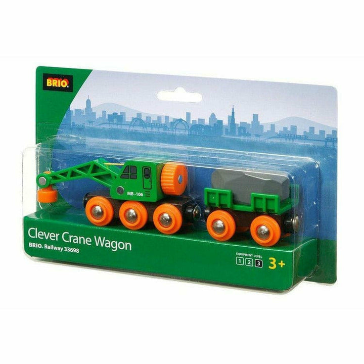 Lift, turn, and deliver. No matter what the goods are, the clever crane wagon for railway gets the job done. Up or down, on or off, turn the crank and get the rock load from the wagon. Off it goes on the BRIO train tracks.