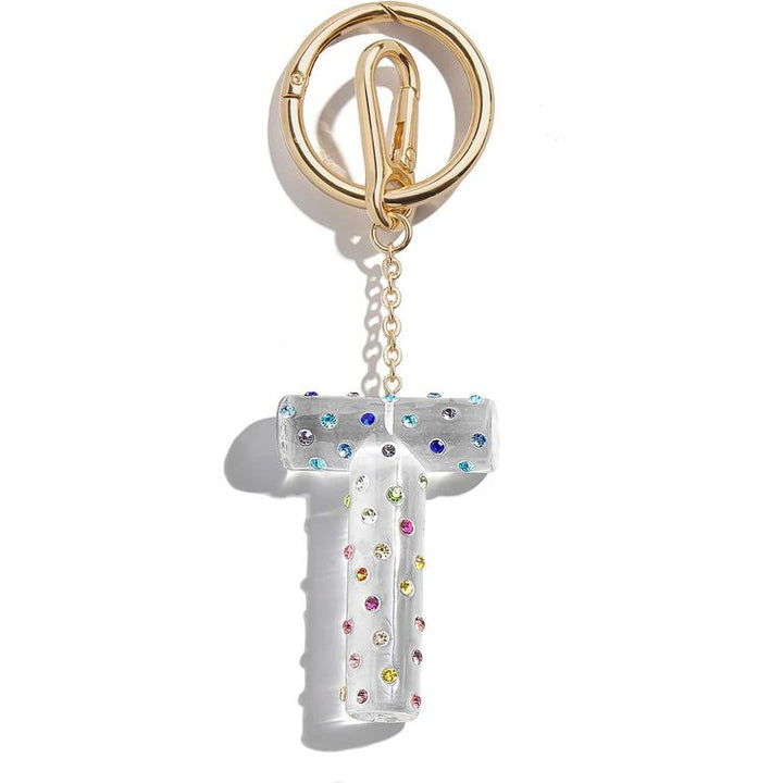 Add some vibrant hues to your bag with the Confetti Initial Bag Charm. Featuring the letter of your choosing in a bold, bubble-letter font, embellished with dainty multicolored stones for added sparkle. Keychain closure Clear initial with rainbow studded gemstones. Dimensions: 5.07" x 2.4"  Ages 3+ Materials: 60% res