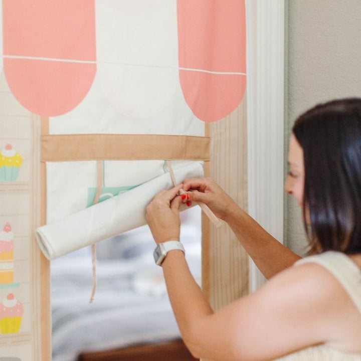 This canvas two-in-one storefront playset is easy to hang, takes up almost no space, and inspires hours of pretend play. One side is a farmers' market printed with a weighing scale, produce, flowers, and more. The other is a bakery showcasing beautiful glass-topped cakes, pastries, and a cash register. Printed on both