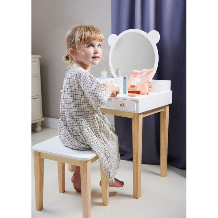Part of our beautiful forest furniture collection, this dressing table and stool is perfect for any little boy or girl. With a total of 5 drawers, there is plenty of storage for little treasures. A generous large round mirror inspired by our forest friends. Material: Wood, Acrylic Mirror Clean with warm towel. Do not u