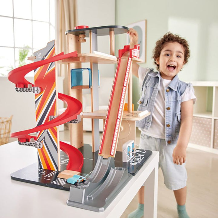Setting up the tracks and racing the cars down the ramp allows children to make up their own intricate stories and adventures with their racing car buddies. AIDS DEVELOPMENT: This toy helps develop fine-motor skills and hand-eye coordination whilst encouraging imaginative play. VARIOUS ACCESSORIES: This garage playset