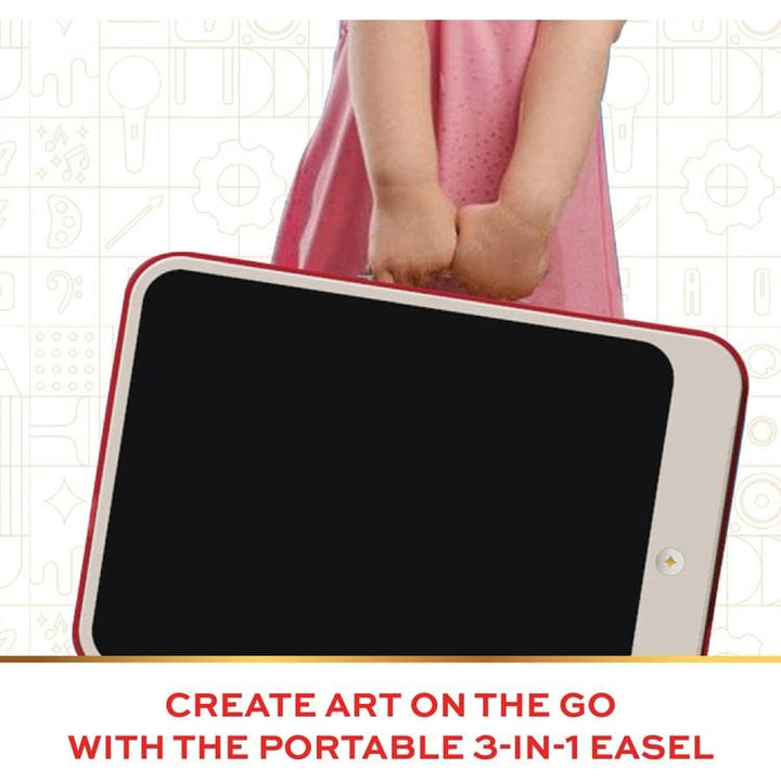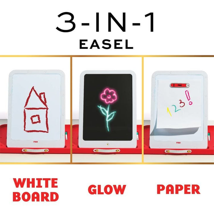 Unleash your child's creativity anywhere with the FAO Schwarz® Glow & Go Easel, a 3-in-1 Light-Up Art Studio that’s designed for versatile drawing and portability. This innovative art studio lets budding artists use it as a whiteboard, a neon glow board, or attach paper for traditional or tracing drawing methods. E