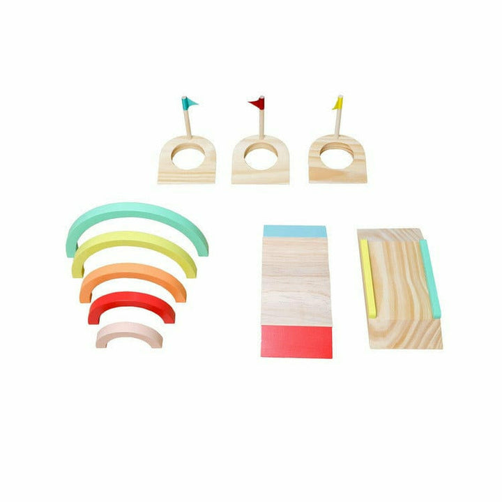 It’s GOOD! It’s WOOD! It’s GOLF! Your kids will have hours of fun with our Good Wood Mini Golf Game. So many different configurations make this game different every time. Set up easy to difficult courses to make the game more challenging. Complete with 3 holes and flags, 2 wooden balls, 5-piece rainbow tunnel, 1 bead