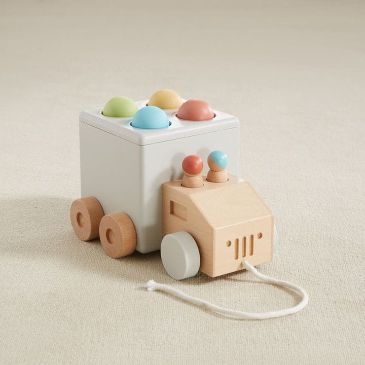 So much to keep baby busy with our Hammer Time Pull Toy. Not only is it a fun pull toy with little wooden drivers, but it’s also a pounding toy and a color matching game. Kiddos will love to pound the giant wooden balls through the matching color holes, then let them all come out by releasing the rear door. Comes wi