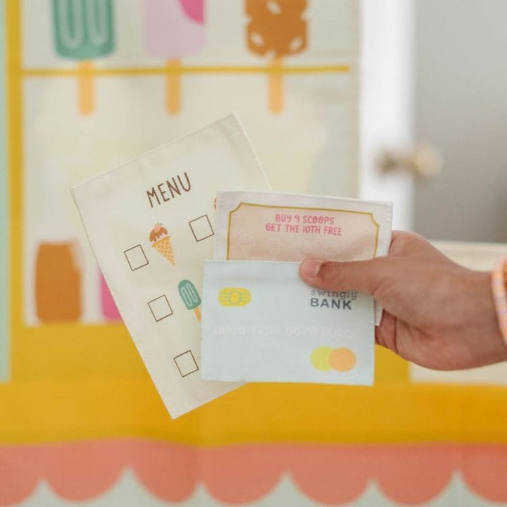 The Ice Cream & Coffee play shop is a two-in-one storefront play set made from machine-washable poly-cotton canvas, is easy to hang, and takes up almost no space to inspire hours of pretend play. One side is an ice cream shop printed with various cones and flavors. The other is a coffee shop showcasing an espresso