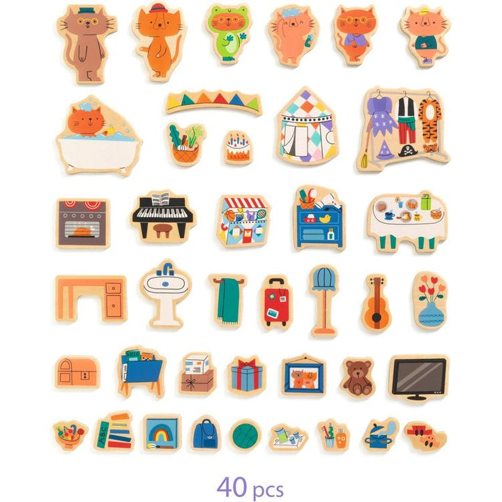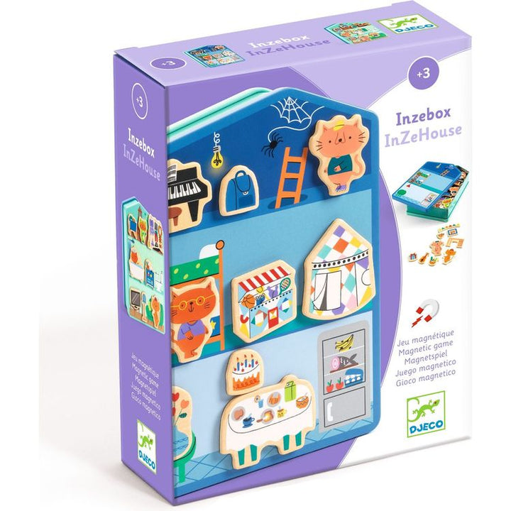 With Inzebox, you can play with wooden magnets on a house-shaped metal box. Have fun decorating the 6 rooms to bring them to life (loft, bedroom, kitchen, living room, bathroom and games room)! Each side of the box represents different rooms for double the fun. Create endless scenes! Premium wooden magnets. Promote chi