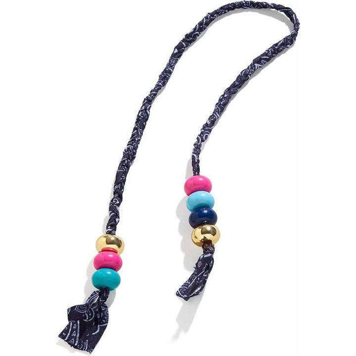 Unleash your adventurous side with our Kenna Braided Bandana Bag Charm in blue! She features a braided bandana fabric and fun beads at the ends, adding a touch of flair to any bag. Adjust the length to your liking. Tie it, knot it, loop it, whichever way you'd like to style! Tie-on keychain Braided bandana with beaded