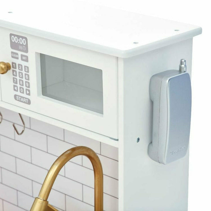Give your little one their own cooking space with the Teamson Kids Little Chef Boston Classic Kids Kitchen Playset. This white retro-style play kitchen features a natural wood countertop, white subway tile backsplash and gold hardware, making it great for both boys and girls, and completes any classroom or playroom. Wi