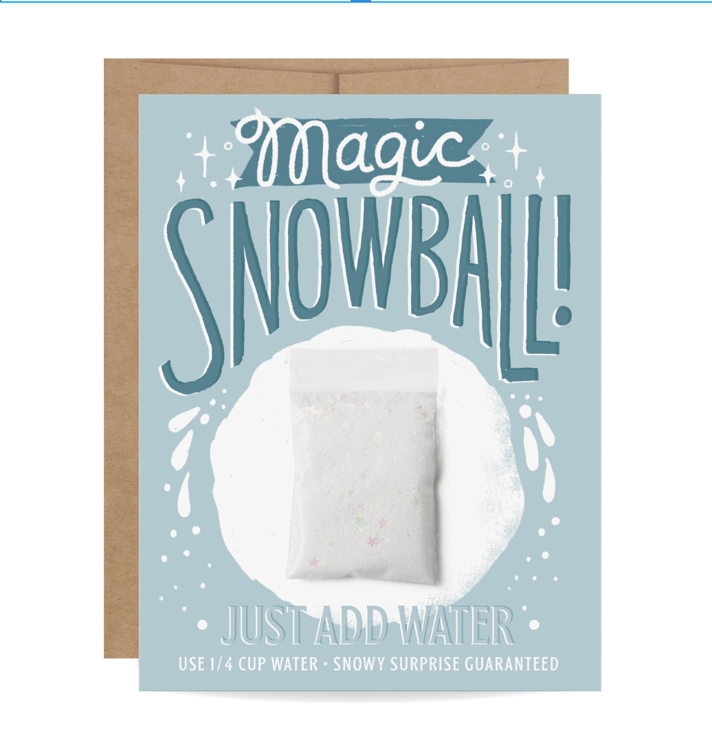 • 5.5 x 4.25 boutique size folded greeting card • Blank inside • 5.75 x 4.5 A2 brown kraft envelope • Includes a package of our DIY snow • Our snow is made from a USA-made. highly-absorbent polymer blended with glitter • Safe to use and non-toxic • Please use supervision with young children • Packaged in a clear cellophane sleeve • Directions enclosed • Sustainably printed in the USA What if you could mail someone a snowball? Simply mix the packet of snow with 1/4 cup of water. and be prepared for a surprise. Snow will grow to 100x its size (roughly the size of a snowball). This card is fun to send to kids. or family/friends living in warm climates! Package dimensions L 5.75 x W 4.5 x H 0.25