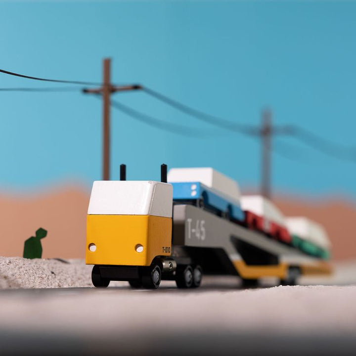 Load up and roll out! The Magnetic Car Transporter is ready to haul up to three CANDYCAR® vehicles eastbound, westbound, or toy chest-bound! Dimensions: 14.3 x 2.0 x 3.3 in Ages 3+ Material: 100% Beech Wood