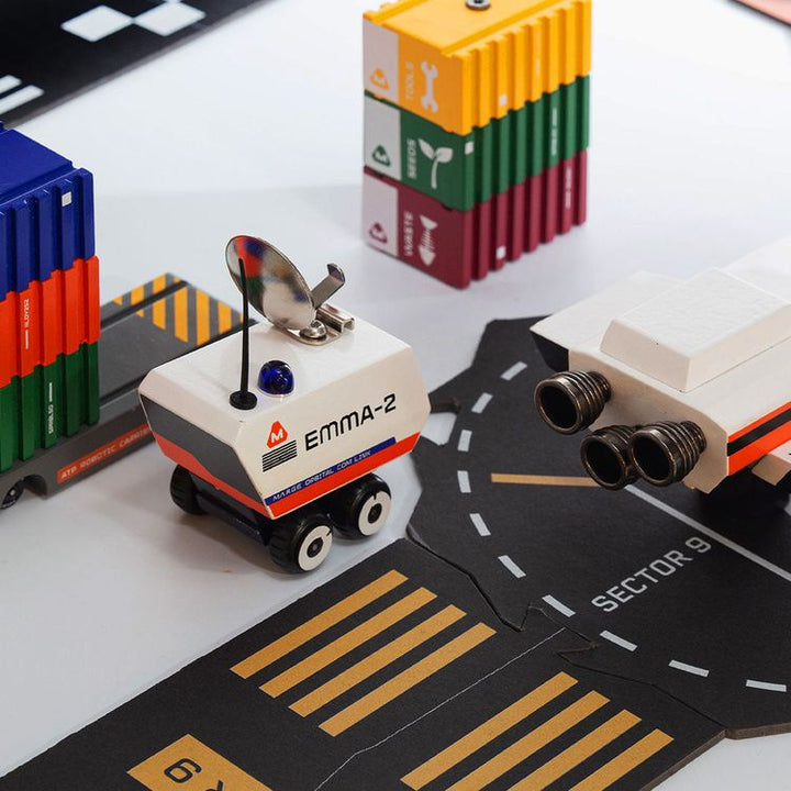 MARGE: Mars Agency for Research + Geographical Exploration The Rogue Echoes play set includes a hi-tech trio of AI-powered vehicles. What's in the box? EMMA-2 comms vehicle with suspension base XB Shuttle with metal propulsion engines ATP with 6 assorted supply containers Puzzle roads Rogue Echoes Comic Book Dimensions