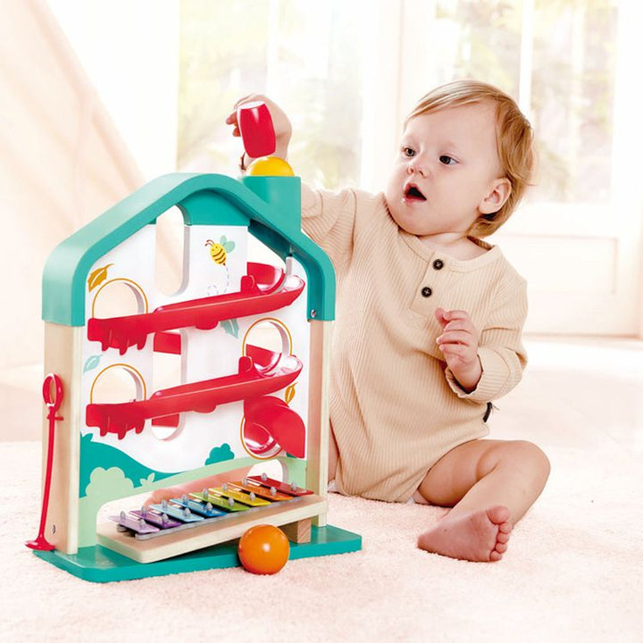 Experience the joy of music and rolling fun with our House-shaped Ball Rolling Game. Navigate the colourful maze, or take out the xylophone board for individual melodic play. LEARNING CAUSE AND EFFECT: Children learn about cause and effect relationships as they observe how their actions like rolling the balls or playin
