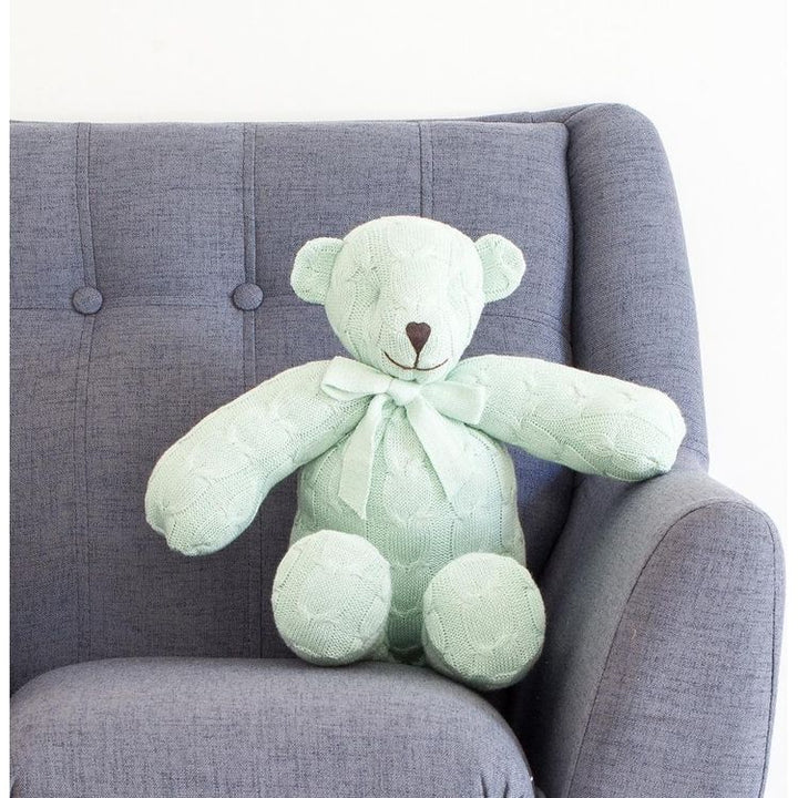 Rian Tricot uses the softest and most durable yarns for their blankets! Their extensive collection of cushions, pillows, and blankets are well-designed with a varying yet complimentary color pallet; each individual product coordinates with others to bring effortless luxury to every nursery.  Cable Knit Plush Teddy Bear