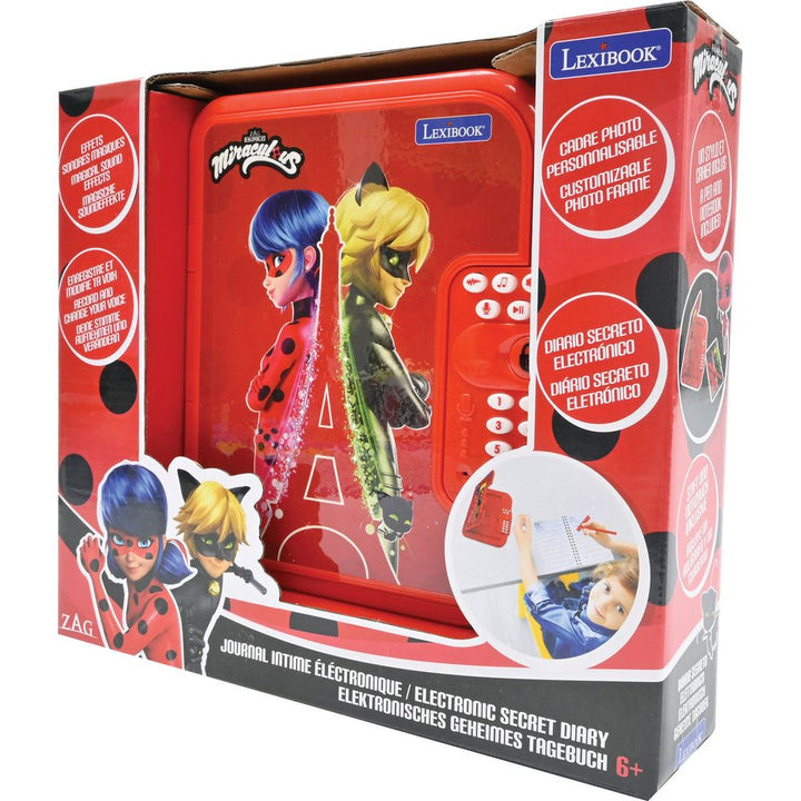 A Miraculous secret safe notebook to write down all your secrets and keep them safe. Create a 4-digit password to unlock the notebook. Fun features: voice recorder, voice changer. Personalise your notebook. A pen included, possibility to change the notebook when you have filled all the pages with your secrets! Dimensio