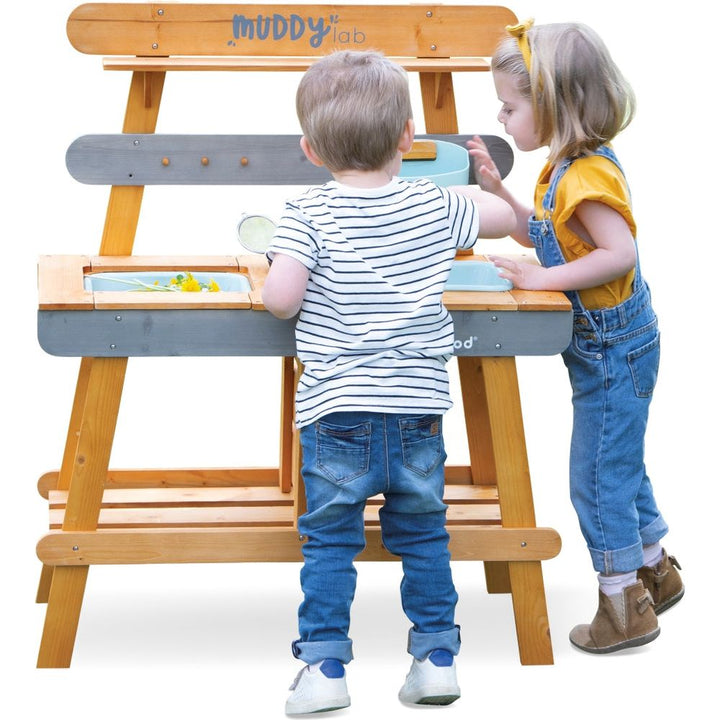 A bit of soil, a few blades of grass, some water, mix it all together, and you have the perfect mud workshop! Let your child thrive in nature and develop their imagination with this solid wood kitchen. Suitable for outdoor use, this toy will withstand all experiments by young and old alike. Delivered with 10 accessorie