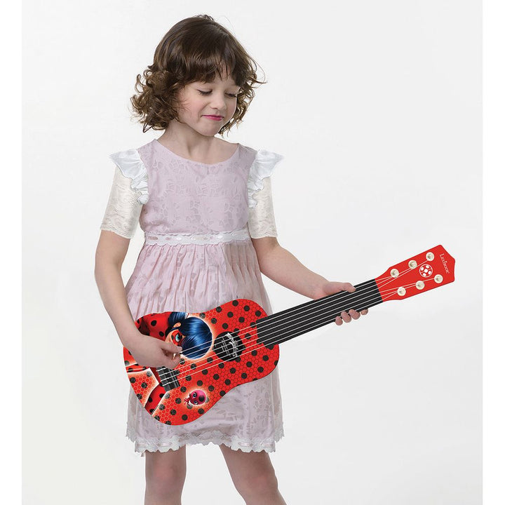 A small guitar with a fantastic Miraculous design, ideal for accompanying young guitarists as they take their first steps in music! Size: approx. 21" Made of plastic. 6 strings. Can be tuned (tuner not included). Includes a guide to learning to play the guitar! Ages 3–5 Years Material: Plastic