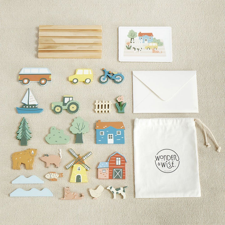 Our My Town Picture Matching Game is a great and fun way to help your kiddos learn placement and sequencing by matching the wooden objects to the pictures.  Our high-quality  set includes a chunky wooden base that holds 21 assorted vehicles, trees, houses, bikes and more.  12 cardboard pictures with scenes to match.  L