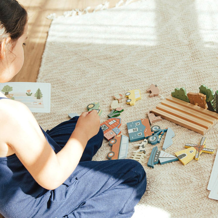 Our My Town Picture Matching Game is a great and fun way to help your kiddos learn placement and sequencing by matching the wooden objects to the pictures. Our high-quality set includes a chunky wooden base that holds 21 assorted vehicles, trees, houses, bikes and more. 12 cardboard pictures with scenes to match. L