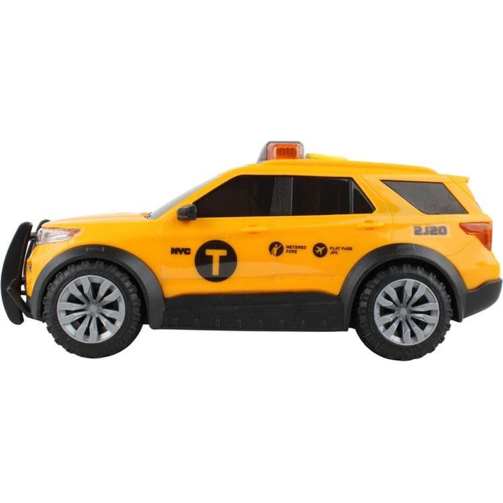 NYC Taxi Ford Escape SUV features light and sound. Free wheeling. Two AA batteries included. 9" long. Lights Sound Free wheeling Two AA batteries included. 9" long Ages 3+ Material Content: Plastic