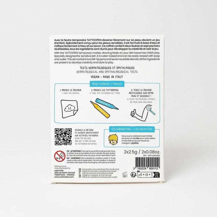 Known for his famous blue sailor and his blond streak, Jo Little is a French artist who transports us into his urban and Parisian universe. Find in this box of temporary tattoo pens in limited edition, the icons of the City of Light and two Tattoopen essential to achieve beautiful tattoos: a blue and a yellow. The temp