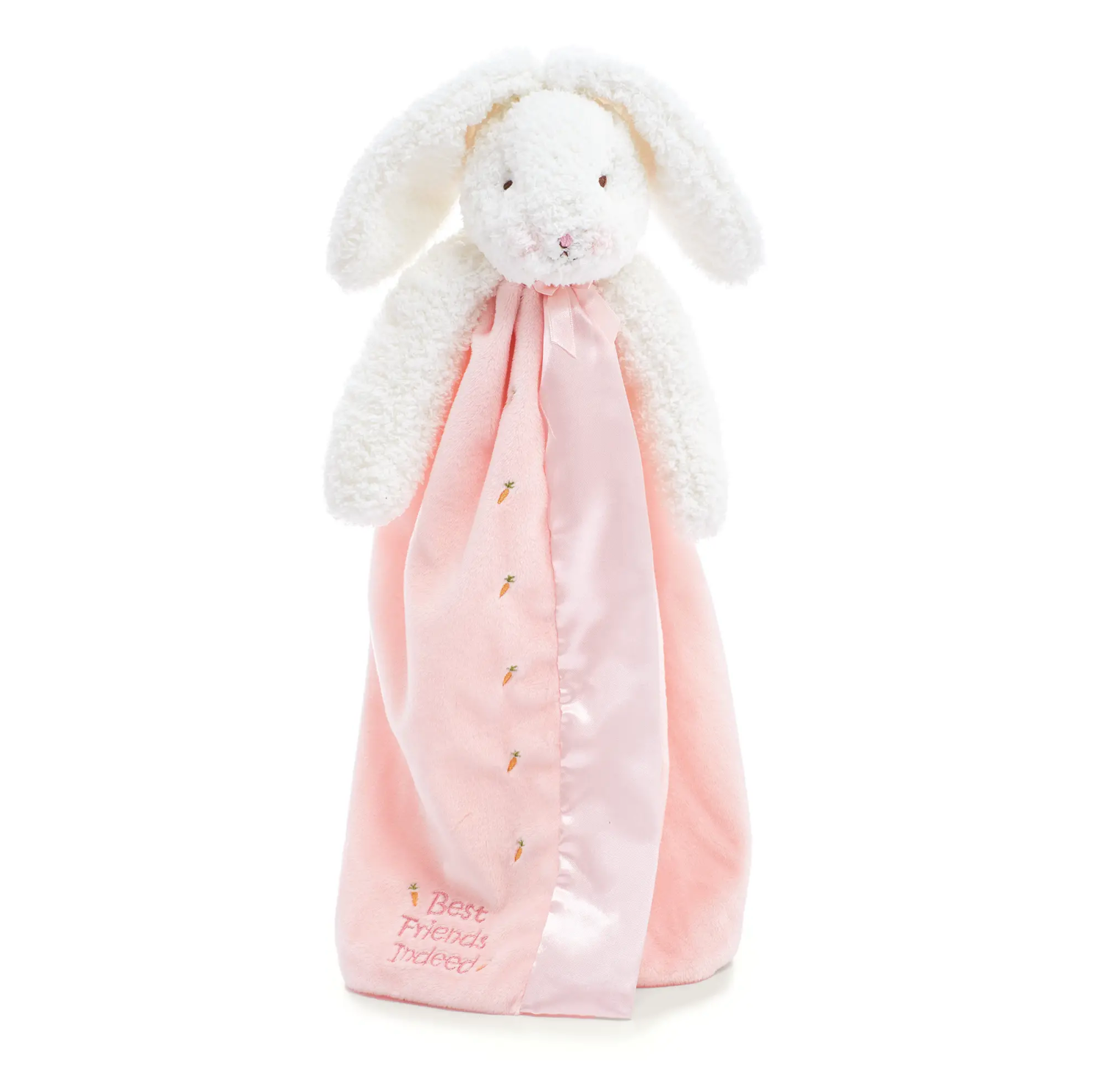 Babies just LOVE our buddy blankets. your best bet is to buy these loveys by the bunch! This favorite security blanket is a plush floppy eared bunny with hand crafted. baby-safe embroidered face and a snuggly soft pink velour split blanket. lined and edged in silky satin. Embroidered message reads. Best Friends Indeed. Signature three carrot tag for little ones fingers. Our security blankets are a must have comfort for baby. Size: 16.