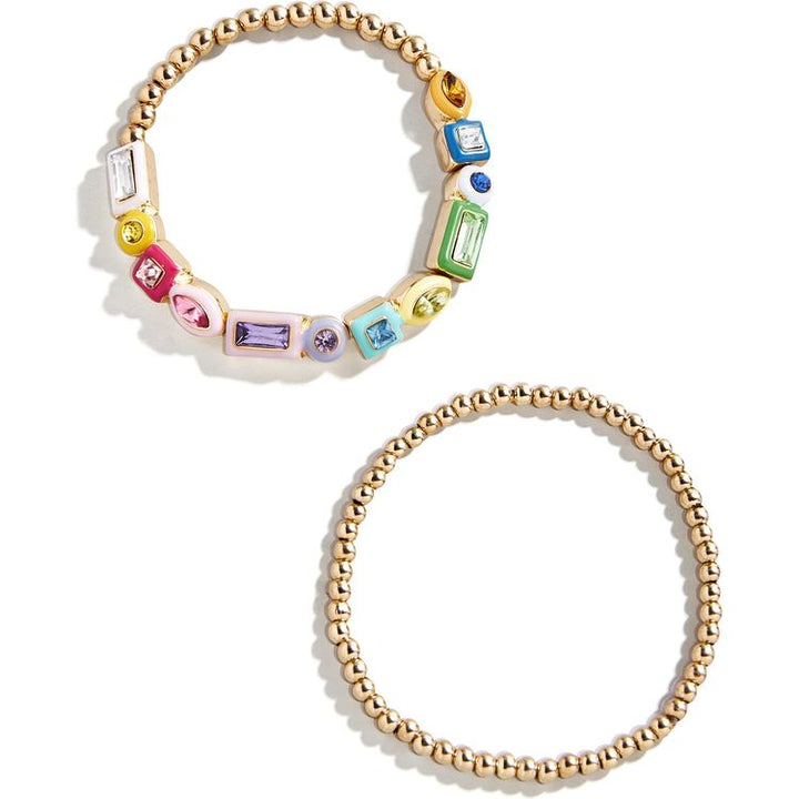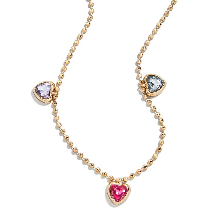 Enjoy some extra love with this 4-piece jewelry set! Inside our pink jewelry storage pouch you’ll find two pisa stretch bracelets — one with classic gold beads and another with colorful multi-shaped gemstones. You’ll also find an adorable charm necklace with three lovely hearts. Mix and match everything in this set or