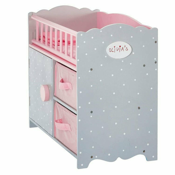 Give your little one's dolly a better night's sleep with the Princess Baby Doll Crib for 18" Dolls with Storage. This multicolor toy bed features an elegant gray and pink design with polka dot details. The playful doll bed includes a removable railing on the side of the crib with a spacious storage cabinet underneath a