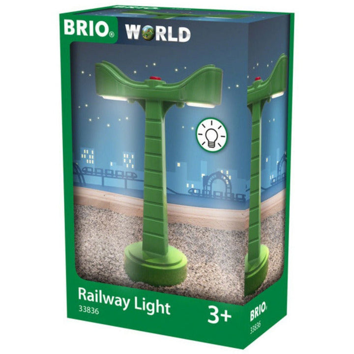 Watch your BRIO World railway tracks shine in the dark with the 33836 Railway Light. This double-sided LED light brings a warm glow to your railway layout and can be turned on and off via a simple red button. After a few minutes, the railway accessory will automatically switch off to save battery power for the next pla