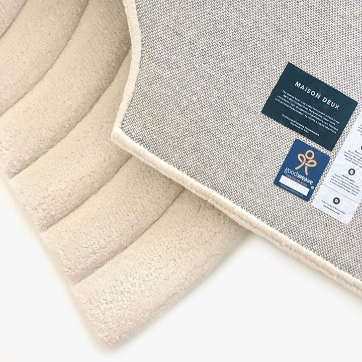 The Rainbow Rug is made of 100% New Zealand wool in a natural color. Each rainbow stripe is roundly cut and hand-carved to create a bubbly embossement. Dimensions:Â 1.7 x 4 ft 100%Â New Zealand Wool Hand-tufted Goodweave Certified Vacuum clean regularly. Clean with a damp cloth. PLEASE NOTE: This item does not qualify fo