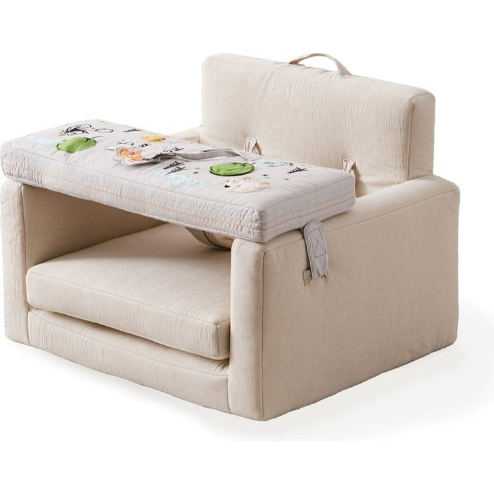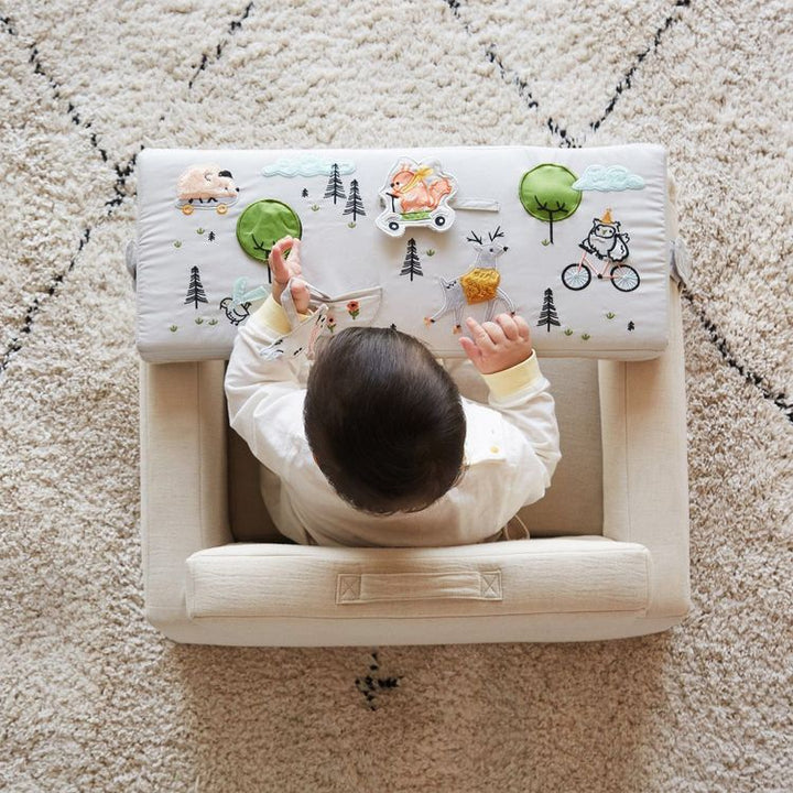 It’s hip to be a square…chair, that is.  Our Rolling Along Square Chair is the perfect place for baby to hang out (when they are able to sit up by themselves) and play with all of the interactive toys on the tray.  They will delight in the sounds of the crinkle, peek-a-boo flap, squeakers, and movable characters, and w