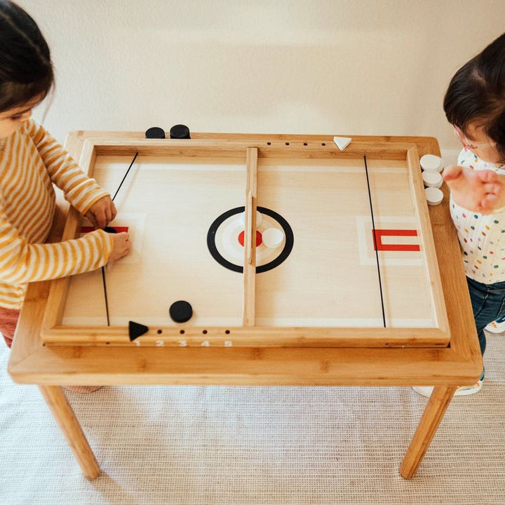 Get your competition on with our Sling-a-Ling Table Hockey Game. Play on any table, on the floor, or slip it right into our Land, Sand and WaterTable for a perfect gaming experience. Comes with 6 black and 6 white pucks, 2 different center gates to increase or decrease difficulty level, and 2 scorekeepers. Pull back