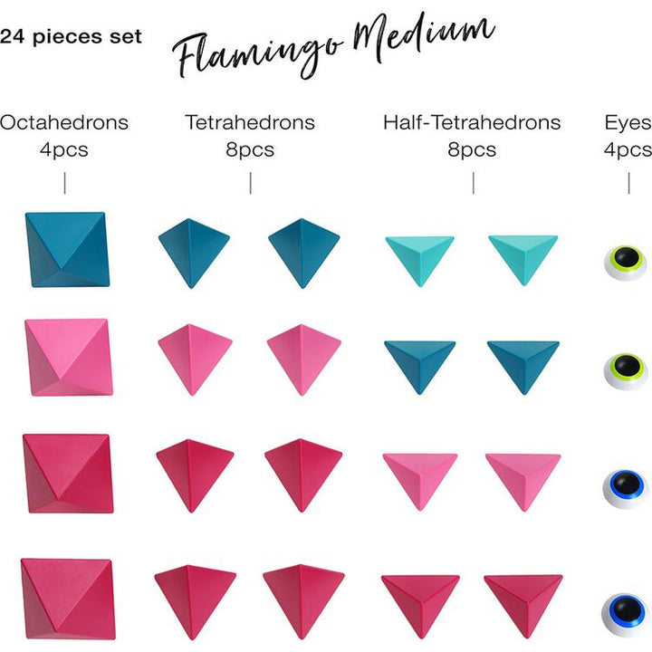 Vivid colors of the Flamingo abound in this 24 piece set includes 4 octahedrons, 8 tetrahedrons, 8 half-tetrahedrons, 4 eyes (in total 24 pieces) + Leaflet. The 24-Piece Set is a medium building set that allows for more characters and objects. Ages 3Y+ Materials: ABS PP magnetite Care instructions: Wipe with damp cloth